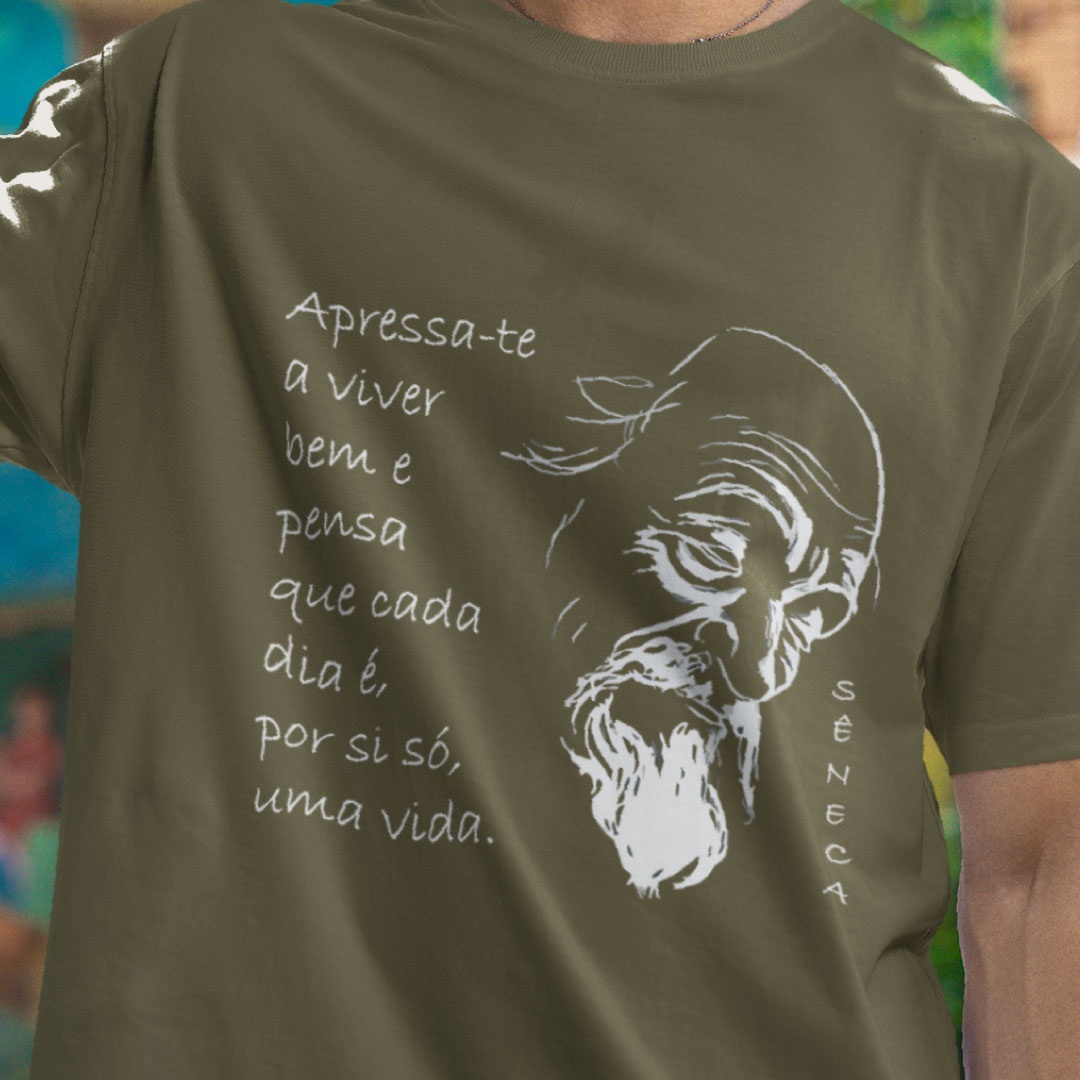 A estampa apresenta a silhueta marcante de Sêneca, em traços minimalistas, acompanhada da citação que atravessa séculos e ainda ecoa nos que buscam sabedoria no cotidiano.
