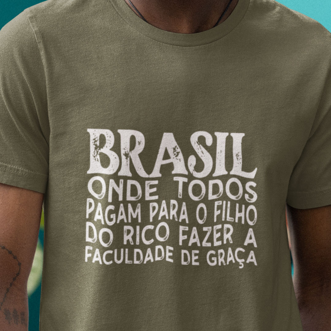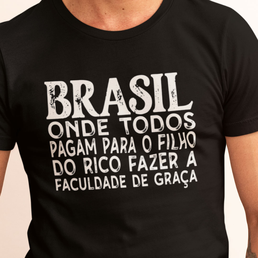 Expresse sua opinião com estilo! Esta camiseta traz uma reflexão profunda sobre o acesso ao ensino superior no Brasil. Com um design minimalista e impactante, a estampa exibe um texto crítico sobre a desigualdade educacional, destacando como o sistema de ensino público universitário favorece, muitas vezes, aqueles que já possuem melhores condições socioeconômicas.