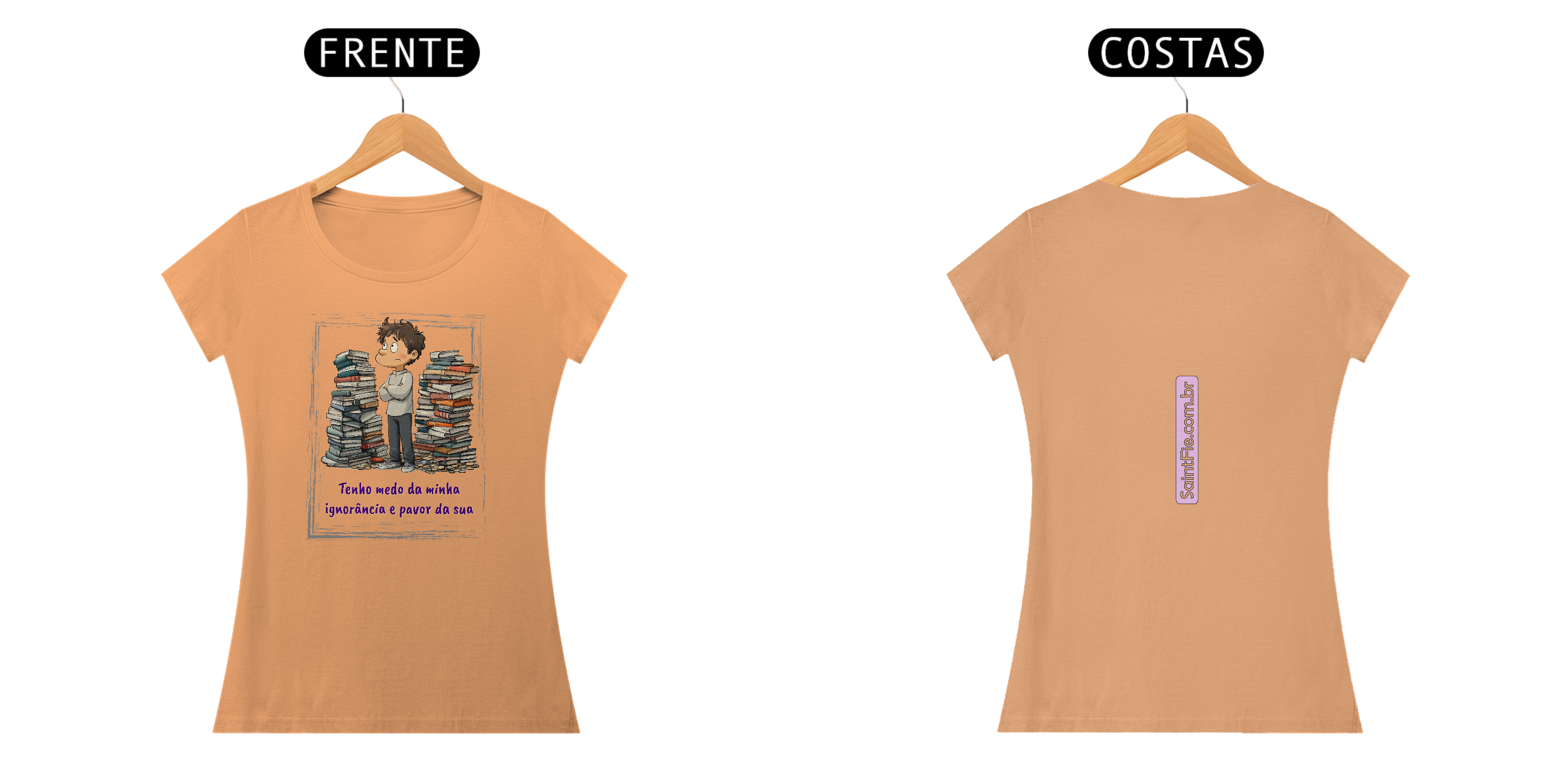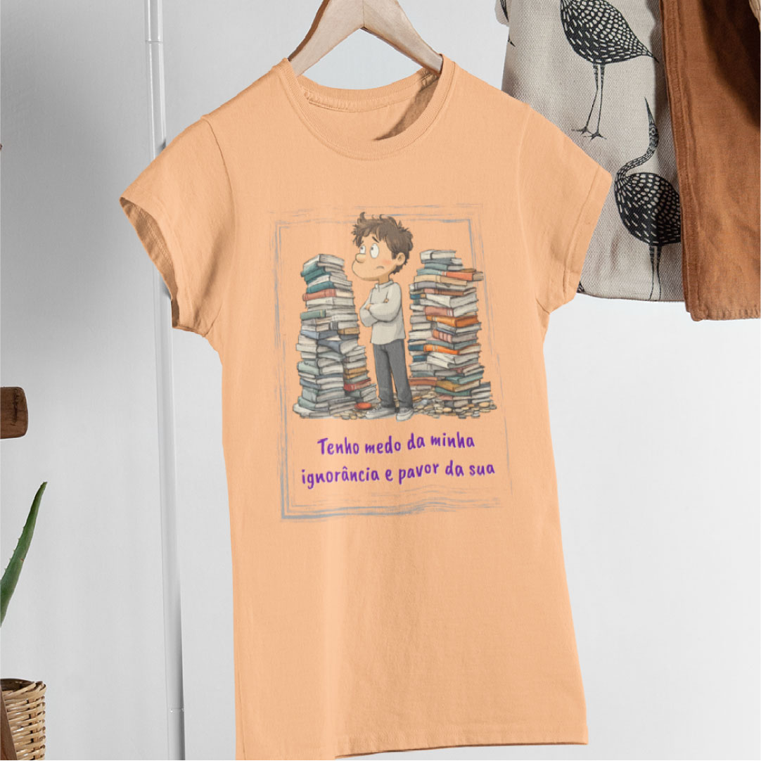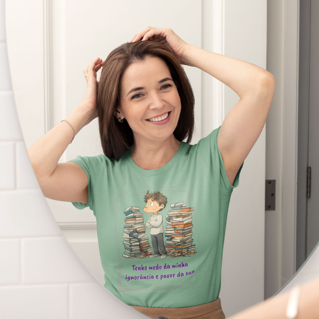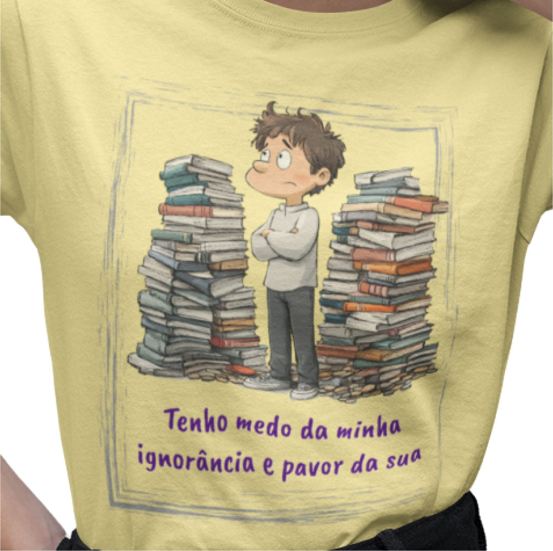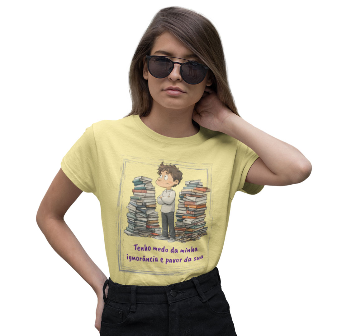 Ela traz uma frase impactante de forma leve mas direta: 'Tenho medo da minha ignorância e pavor da sua', perfeita para quem gosta de unir moda e pensamento crítico, com o interlocutor preocupando-se com a autocrítica ao dizer sobre o medo que sente da sua própria ignorância ao mesmo tempo que motiva a todos que combatam a sua. É para quem não tem vergonha de si e tem autenticidade nas suas palavras.
