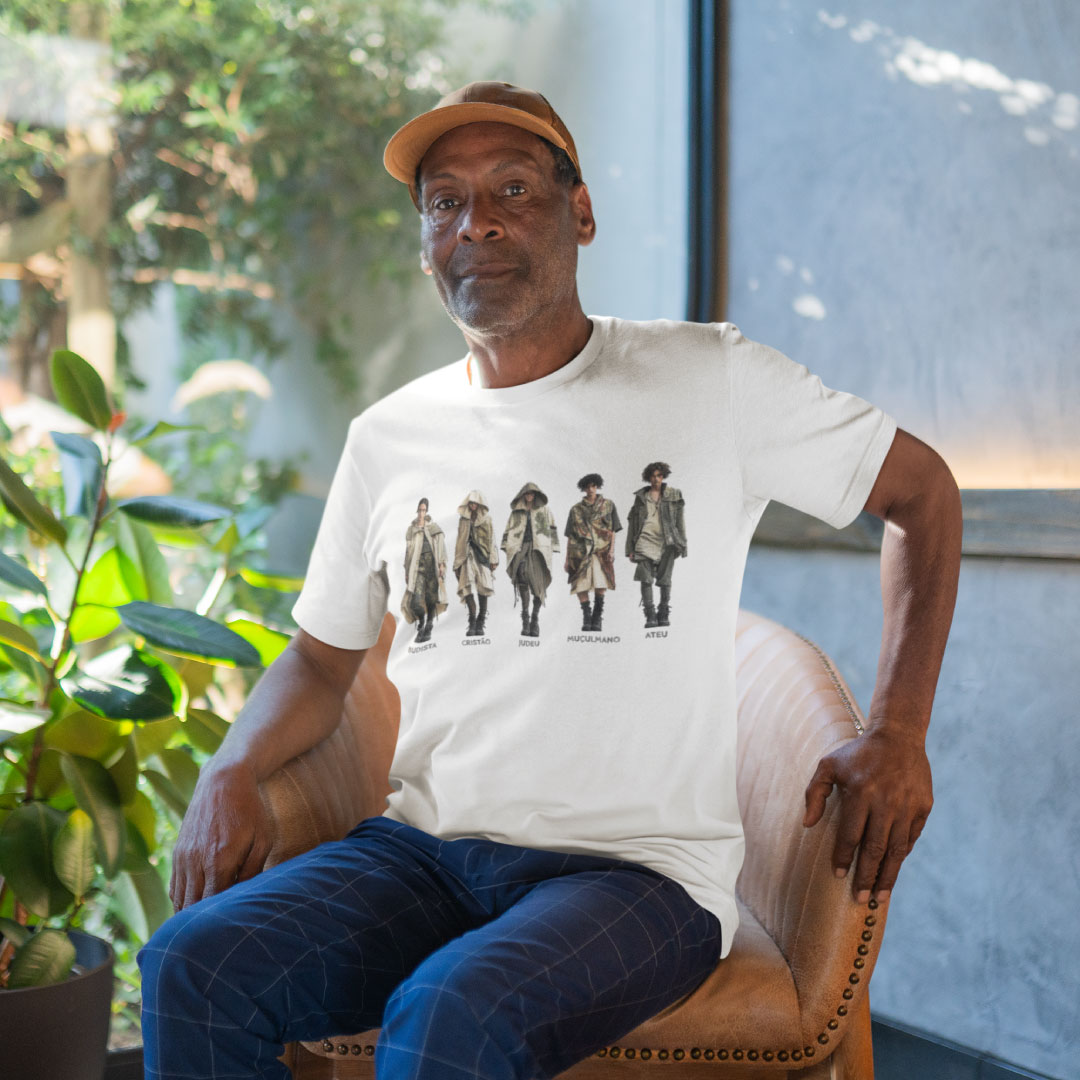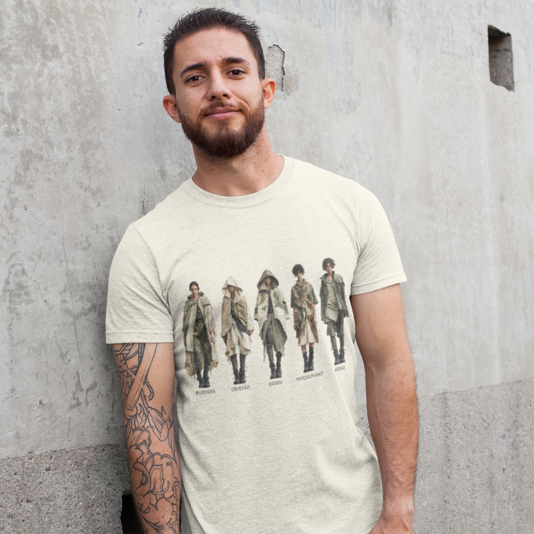 Essa estampa celebra a pluralidade de crenças e ideias, reunindo cinco personagens que representam diferentes visões do mundo: o ateu, o muçulmano, o judeu, o cristão e o budista. Apesar de suas diferenças culturais, espirituais e filosóficas, eles caminham juntos, lado a lado, como símbolo de respeito, tolerância e humanidade compartilhada.